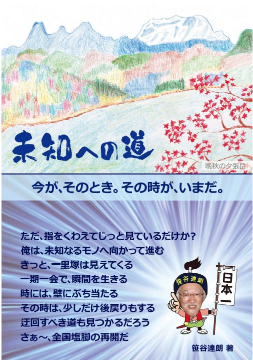 | ただ、指をくわえてじっと見ているだけか? 俺は、未知なるものへ向かって進む きっと、一里塚は見えてくる 一期一会で、瞬間を生きる 時には、壁にぶち当たるだろう その時は、少しだけ後戻りもする 迂回すべき道も見つかるだろう さぁ~、全国塩脚の再開だ |