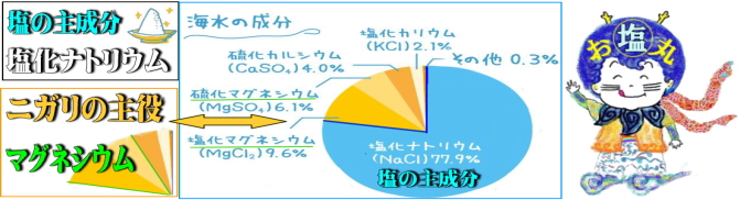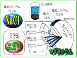 海水には、塩素、ナトリウム、硫黄、マグネシウム、カルシウム、カリウム、炭素、臭素などの元素が溶けています。このうちの85%を占めるのが塩素とナトリウムです。すなわち食塩の主成分である塩化ナトリウムが溶けているから塩からいのです(市販の食卓塩のビンに食塩の成分が記してあります)。